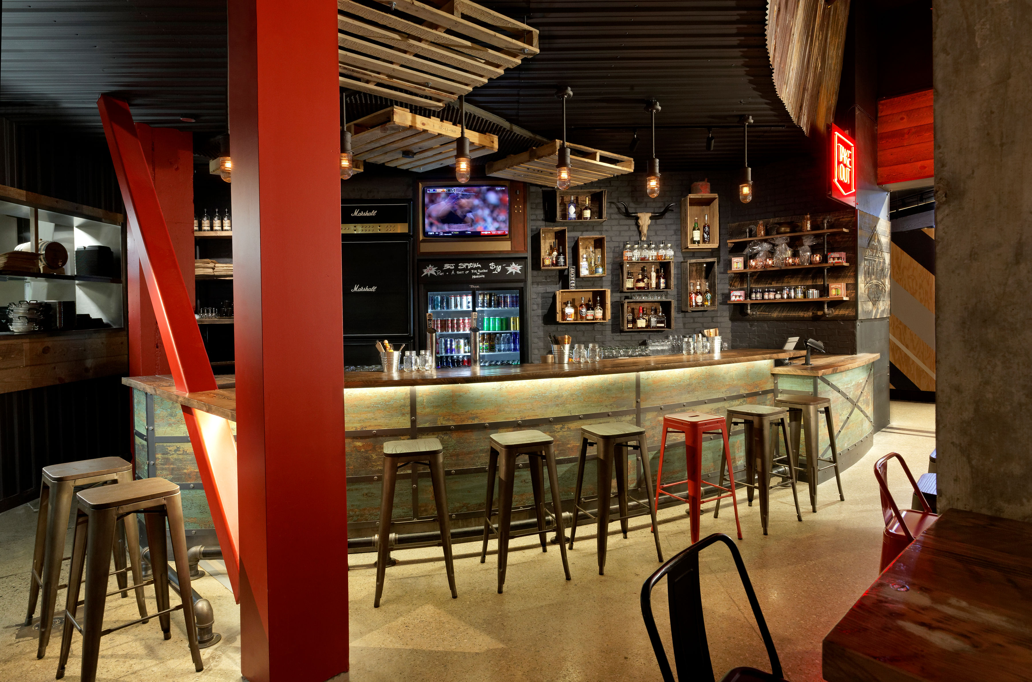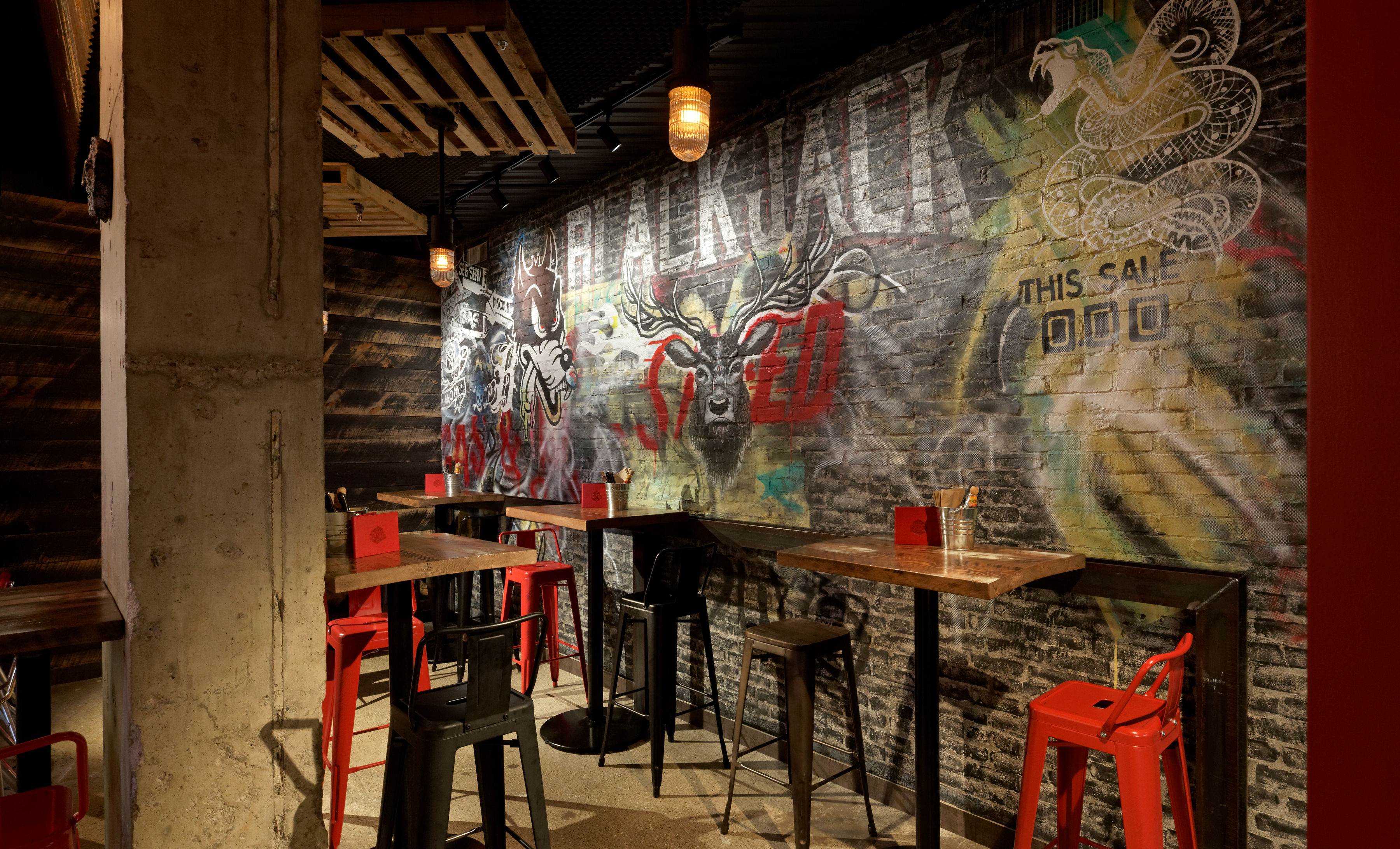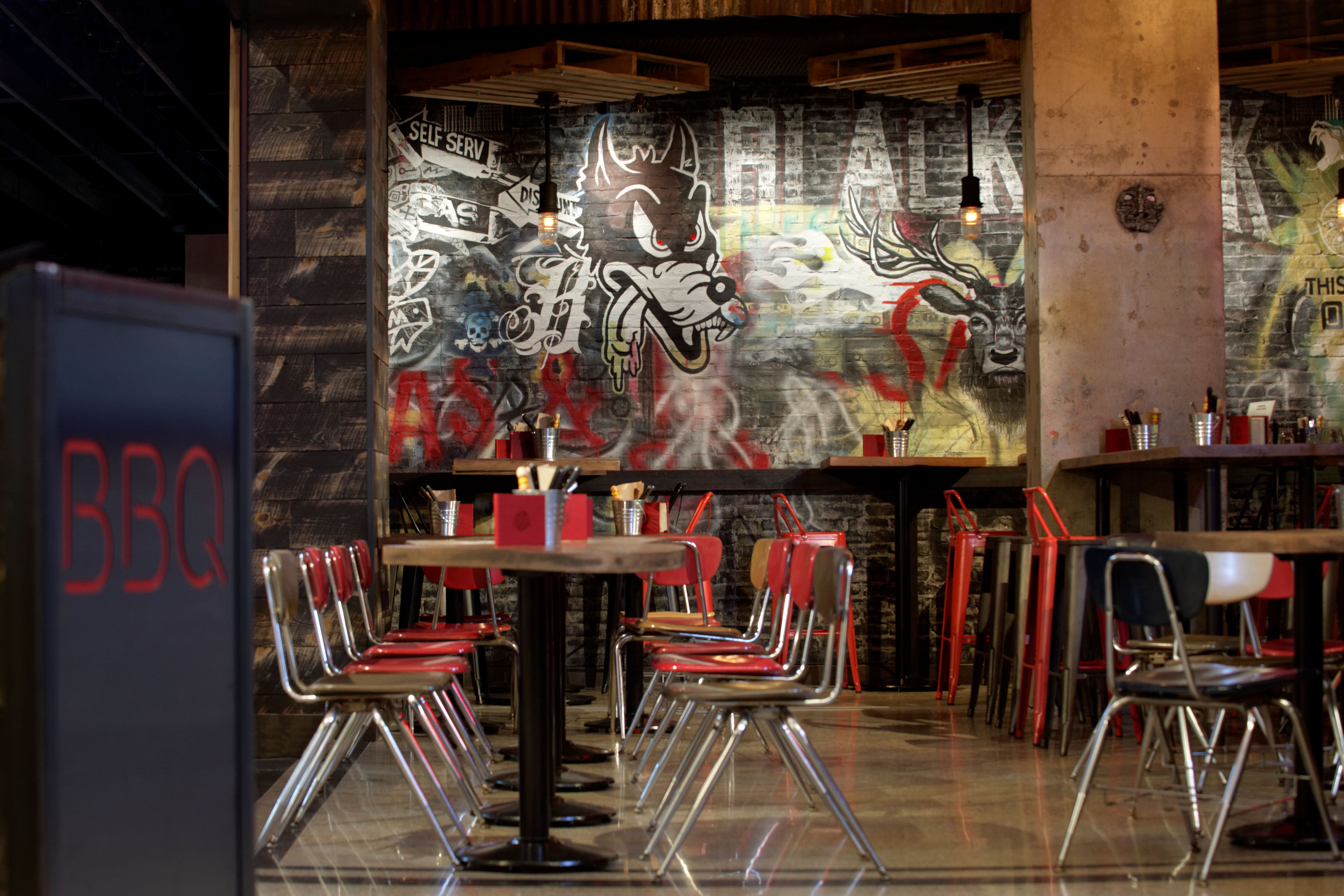One of a kind New Orleans smoke meat themed restaurant located in the new Food District Square One Mall Mississauga, Ontario, Canada. All of this custom made workmanship was integrated with unique one off faux millwork music amps, and a feature mural created by the famous Toronto mural artist, Christian De Araujo. Everything came together to create a unique atmosphere and overall visual delight.